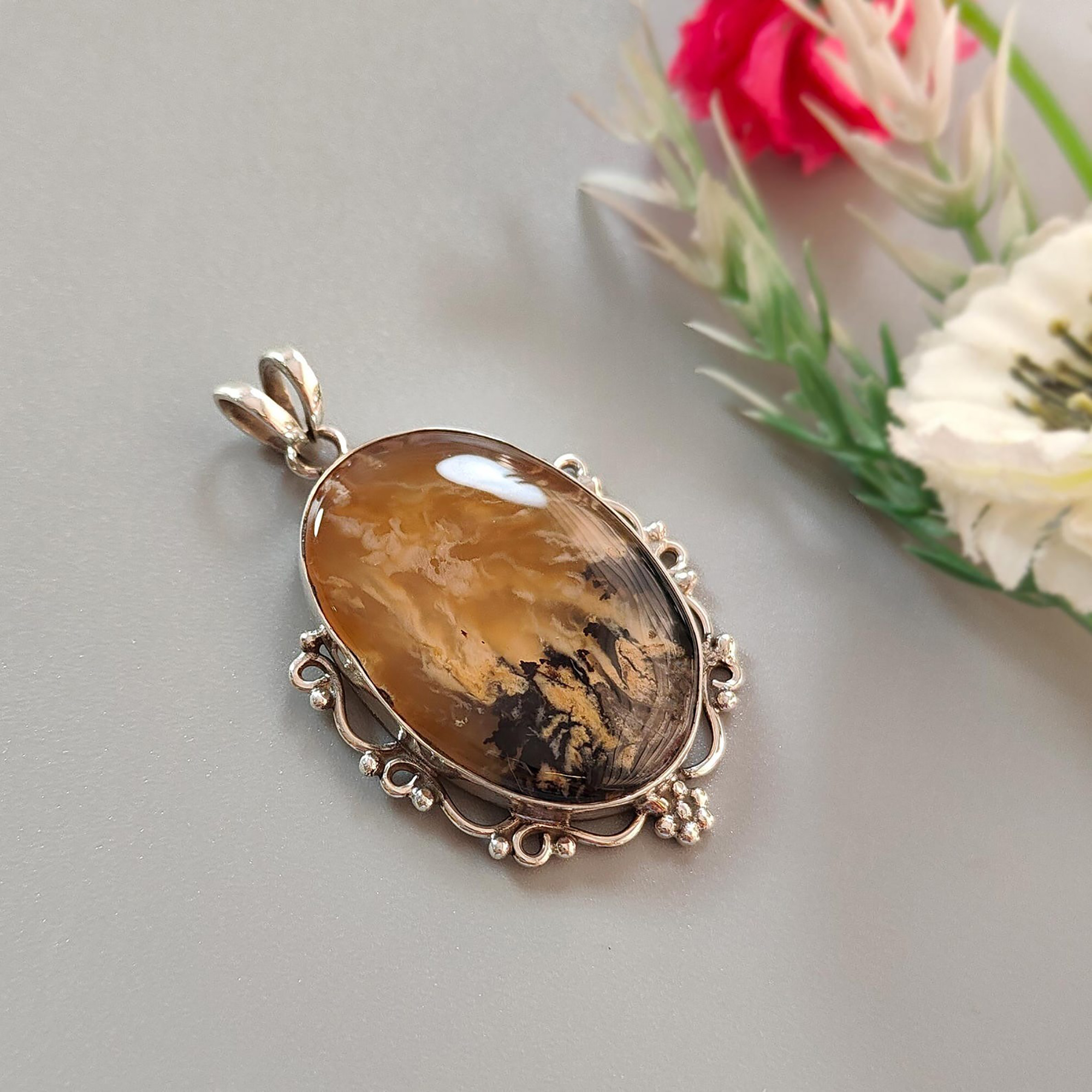 13.32gms Natural Tiger Dendrite Agate Gemstone Bi-Color Agate Plain Oval 925 Sterling Silver Bezel Set Pendant 2″