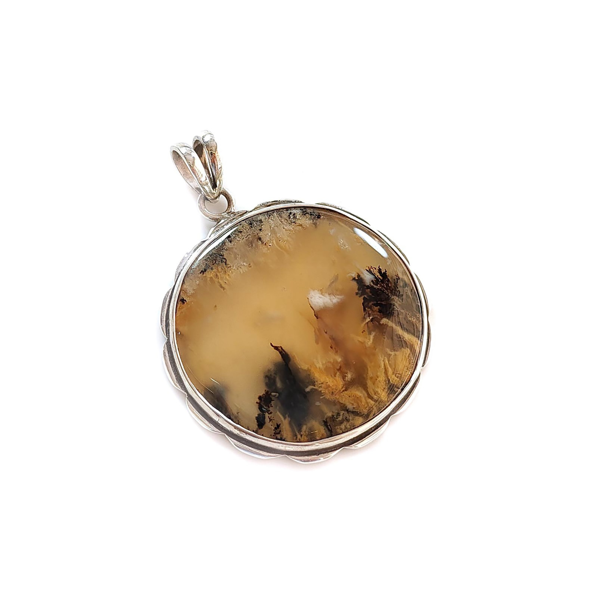 14.66gms Natural Untreated Tiger Dendrite Agate Bi-Color Gemstone Plain Round 925 Sterling Silver Bezel Set Pendant 2″