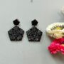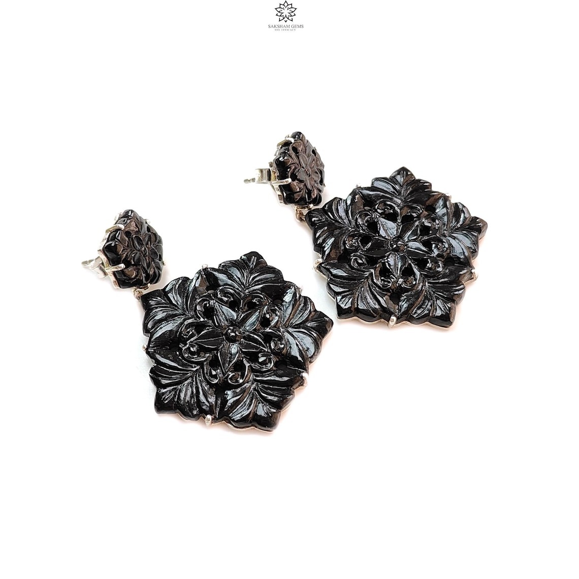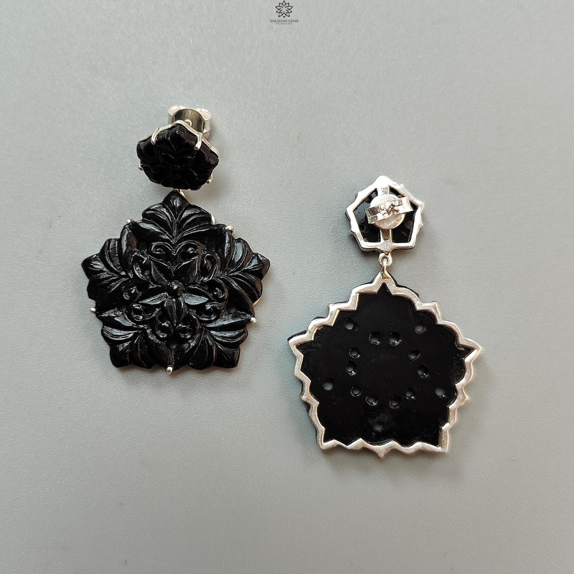 14.82gms Natural Black Onyx Hand Carved Hexagon 925 Sterling Silver Prong Set Push Back Stud Earring 2″