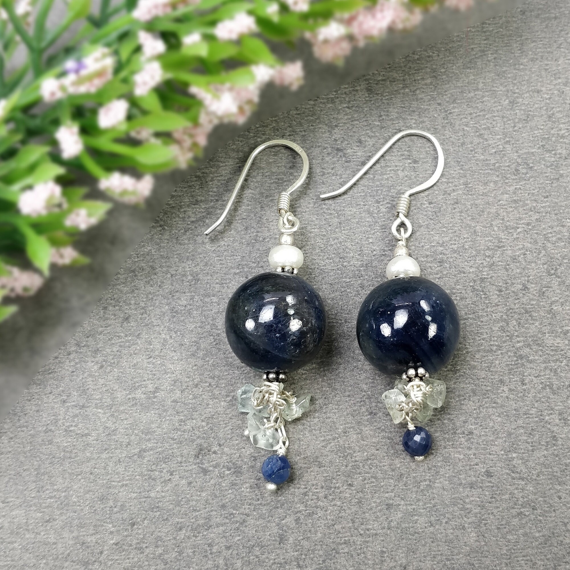 15.29gms Natural Blue Sapphire, Emerald Beads 925 Sterling Silver Plain Drop Dangle Hook Earring 2″