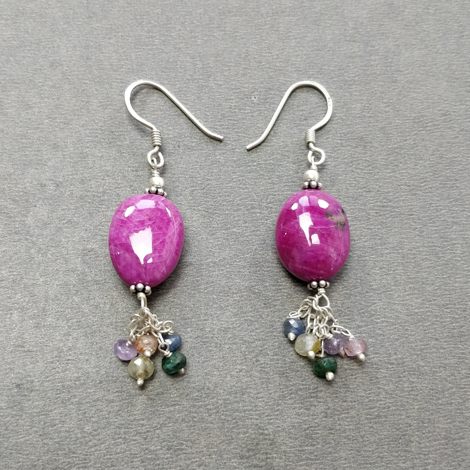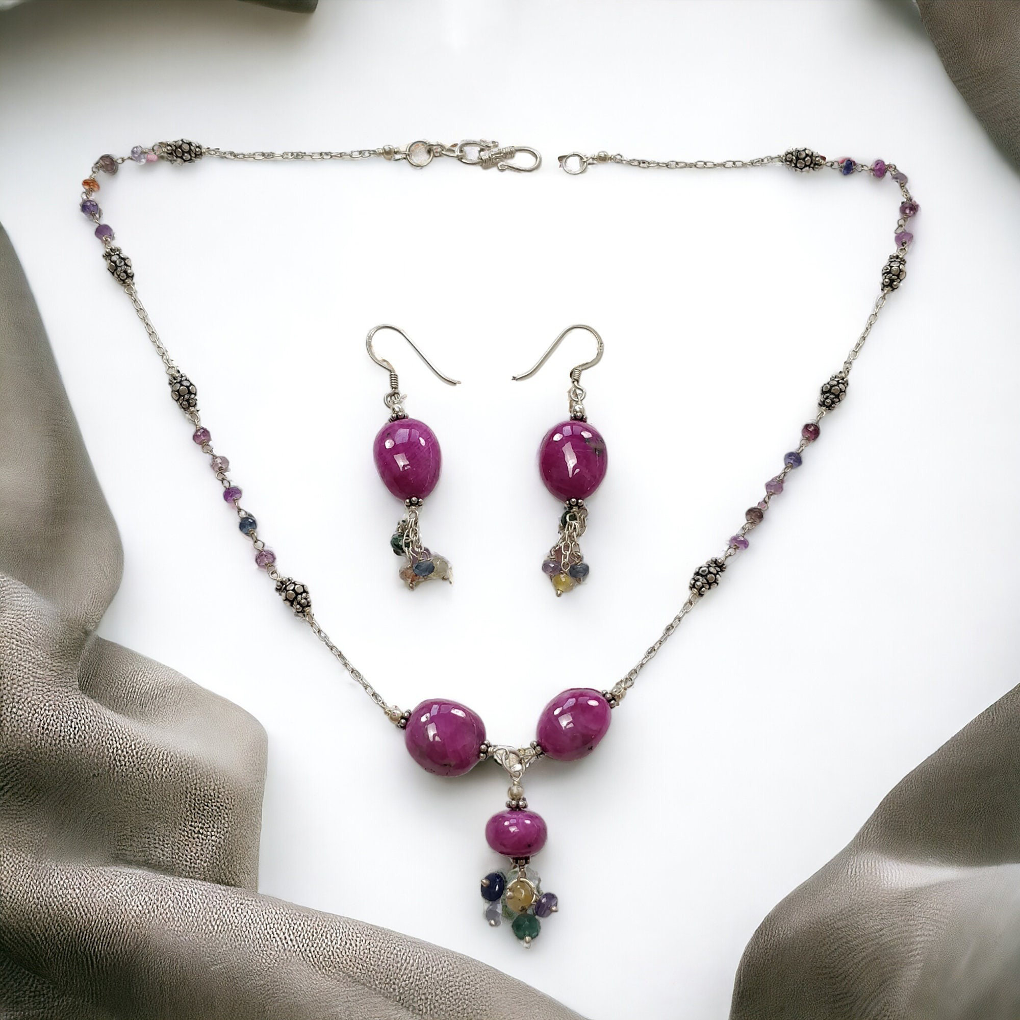 30.43gms Natural Untreated Ruby & Emerald Sapphire Faceted Plain 925 Sterling Silver Earrings Beads Chain Necklace Jewelry Set