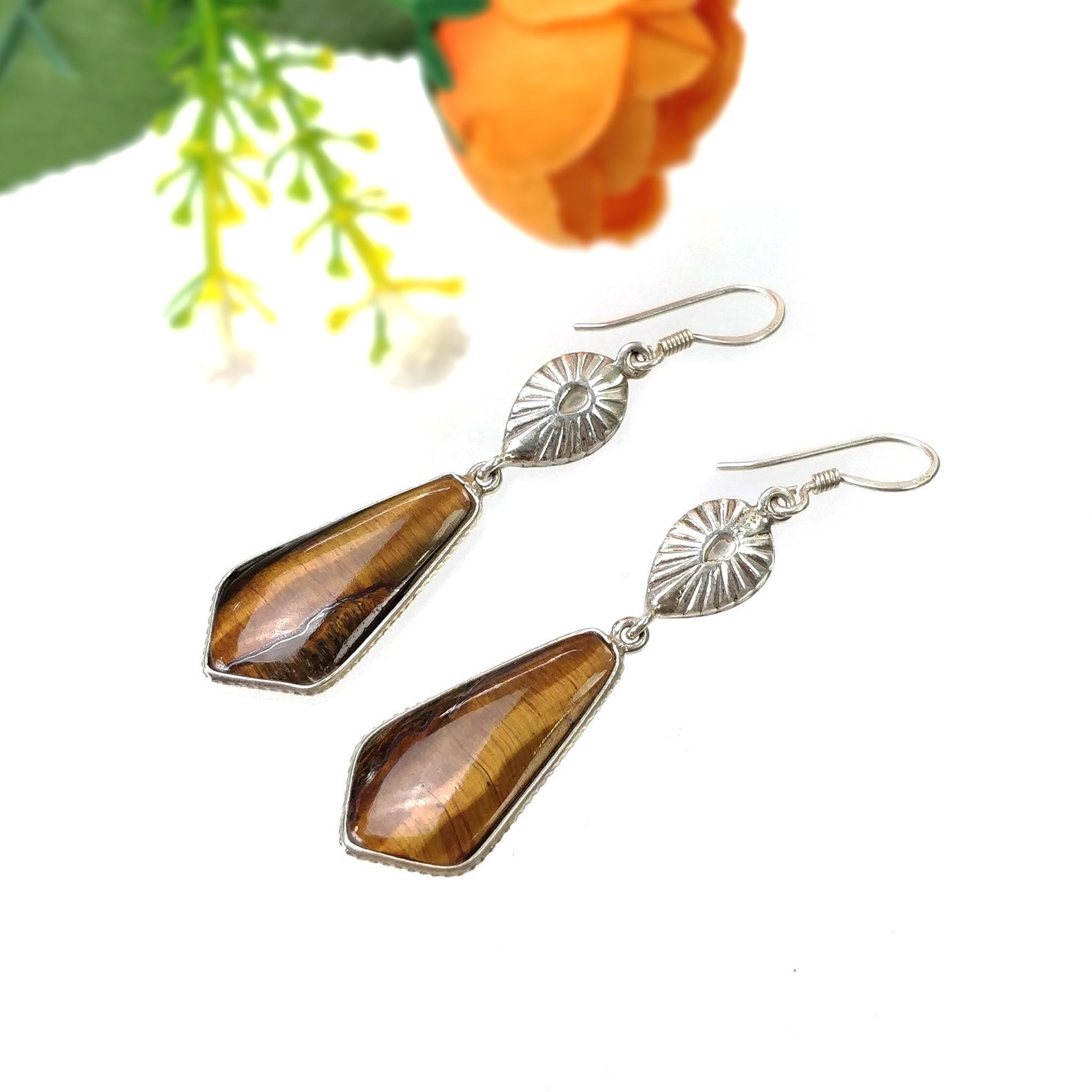 Home » Shop » Natural Tiger Eye Gemstone 925 Sterling Silver Dangle Hook Earring