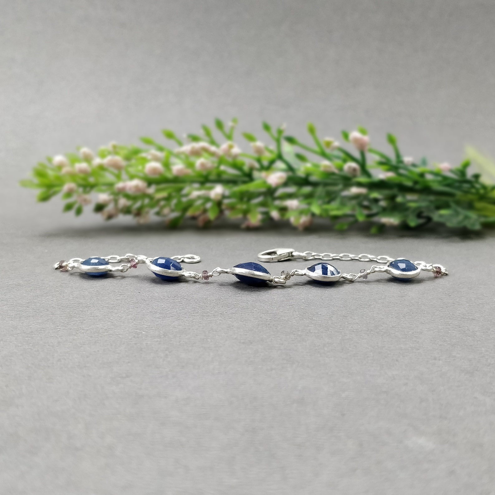 5.70gms Natural Blue Sapphire Gemstone 925 Sterling Silver Round Checker Cut Briolette Bezel Set Chain Bracelet 8″