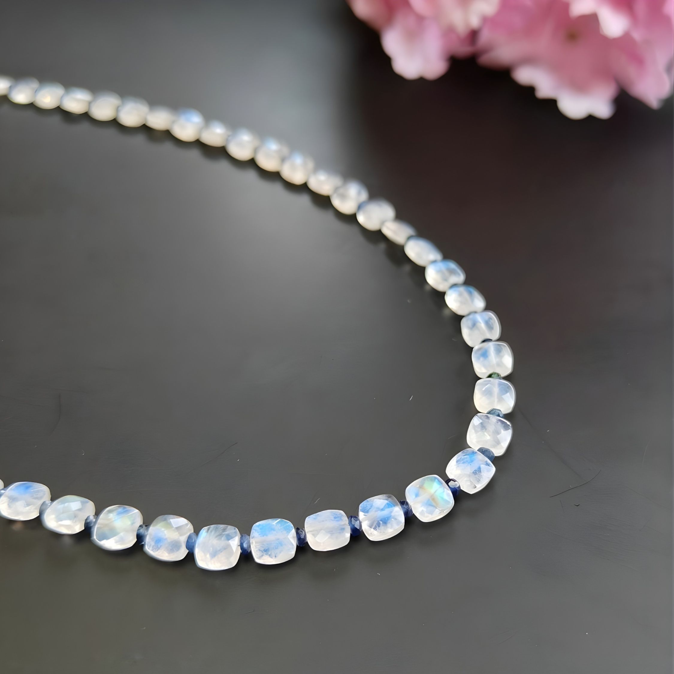 6.33gms Rainbow Moonstone & Blue Sapphire Gemstone Briolette Checker Cut 925 Sterling Silver Beads Bracelet 8.5″